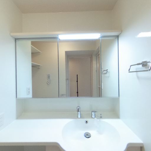 • 独立洗面台と大きな三面鏡(確度86%):カウンター一体型の独立洗面台に大型の三面鏡があり、収納や身支度がしやすそう。