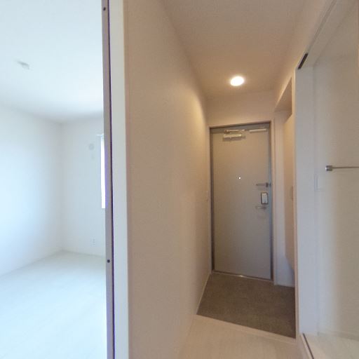 • 玄関周りが明るく清潔感あり(確度80%):白基調の壁・建具とダウンライトで玄関が明るく見える。床もグレーのタイルで清潔感がある。