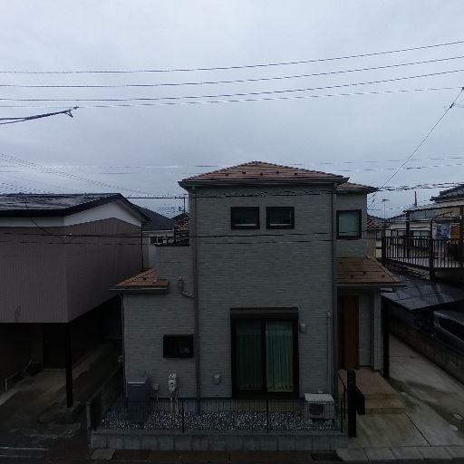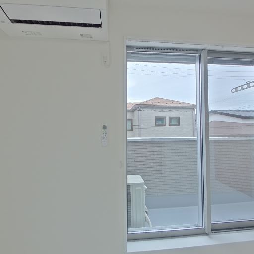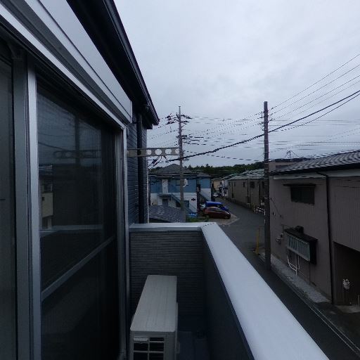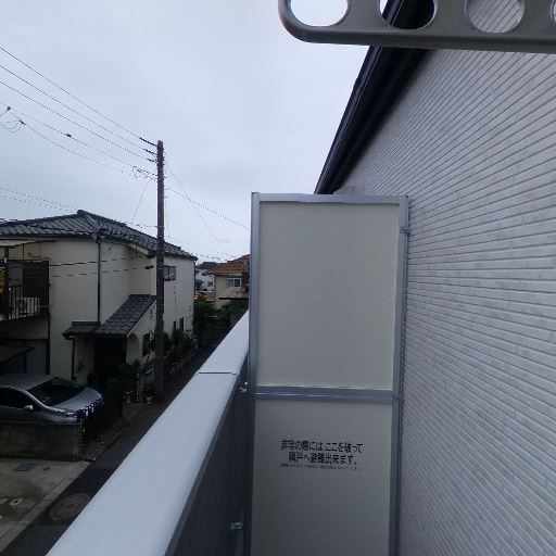 バルコニー前の抜け感はあるが近隣建物は近め(確度83%):正面側には向かいの戸建てが見えており、完全に開けた眺望ではない一方で、道路や空が見えるため一定の抜け感はある。