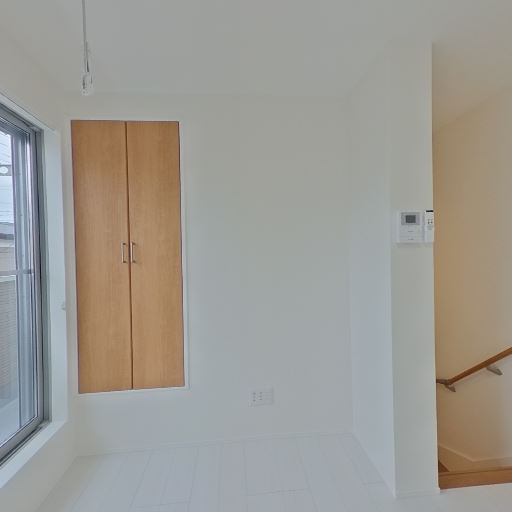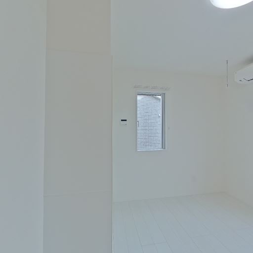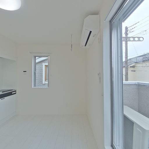 大きな掃き出し窓で明るい室内(確度93%):壁一面に近い大きな掃き出し窓があり、室内に自然光がしっかり入る構成に見える。白基調の内装も相まって全体的に明るく感じられる。