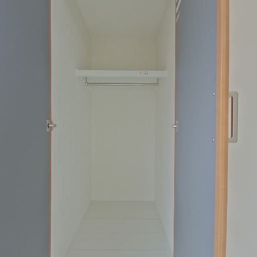 クローゼットがあり収納を確保できる(確度95%):扉付きのクローゼット内にハンガーパイプと上部棚が設けられており、衣類や小物を整理して収納できる。