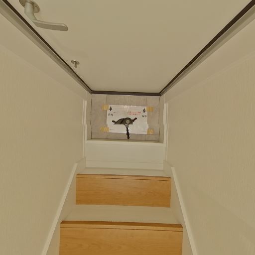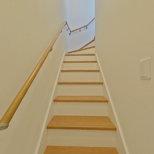 階段が明るく清潔感がある(確度88%):白い壁と明るい木目の踏み板で統一されており、全体として清潔感のある内装に見える。壁面や段板にも目立つ大きな汚れは確認しにくい。