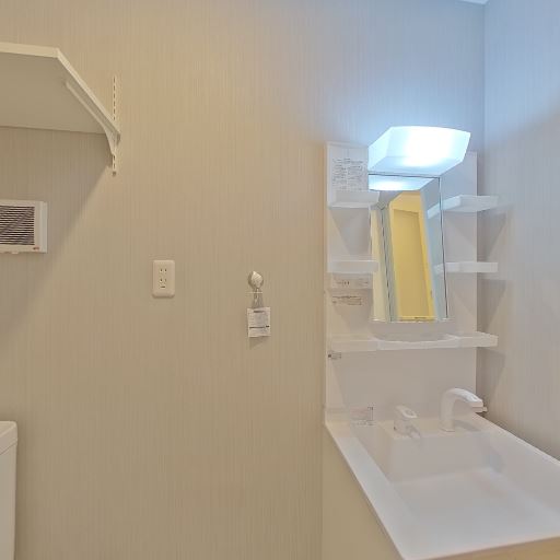 洗面台が独立していて使いやすそう(確度92%):トイレ・洗濯機置場のある空間内に独立した洗面台が設置されており、身支度や手洗いがしやすい構成に見える。鏡まわりに小物置きもある。