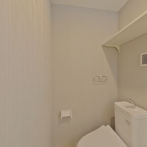 トイレ上部の棚で収納を確保できる(確度88%):トイレ上部に棚があり、トイレットペーパーや洗剤などを置ける収納スペースがある。限られた洗面脱衣室内では実用性が高い。