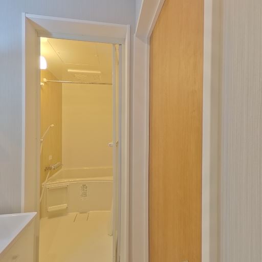 浴室が洗面スペースの近くにまとまっている(確度89%):浴室入口が洗面台のすぐ近くにあり、水回り動線がコンパクトにまとまっている。脱衣から入浴までの移動はしやすそう。