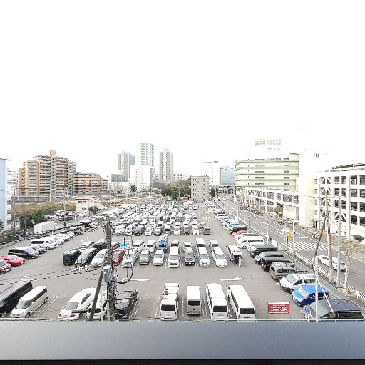 • 眺望の抜け感(確度86%):前面が大きな駐車場と道路で高い建物との距離があり、視界が遠くまで開けている。都市景観が見える。