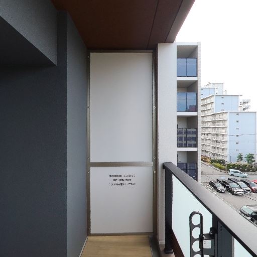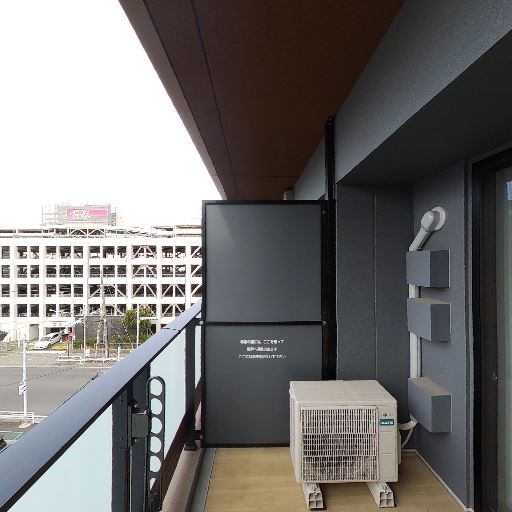 • バルコニー設備と室外機位置(確度74%):バルコニーにエアコン室外機があり、手すりは半透明パネル。