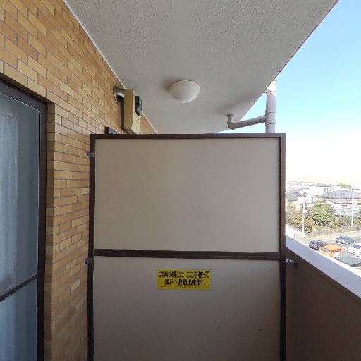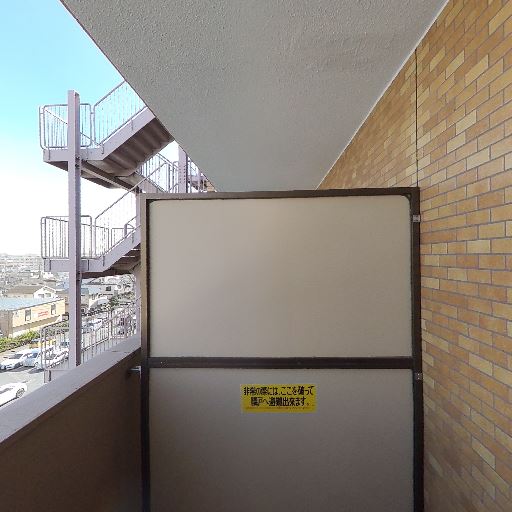 • 避難経路付きの一般的な共用廊下側バルコニー仕様(確度90%):隣戸との境に非常時に破って避難するタイプの隔て板が設置されている。集合住宅として一般的な仕様だが、完全な遮音・遮蔽には限界がある。