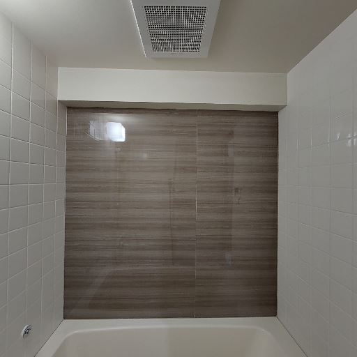 • 浴槽まわりが比較的きれいに見える(確度87%):浴槽本体や正面の壁面パネルに目立つ大きな汚れ・カビは見当たらず、全体として清潔感がある。