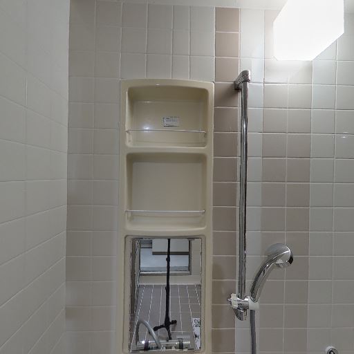 • 収納棚とミラーがあり使い勝手は悪くなさそう(確度88%):シャワー横に埋め込み型の棚とミラーがあり、シャンプー類や小物を置きやすい構成になっている。