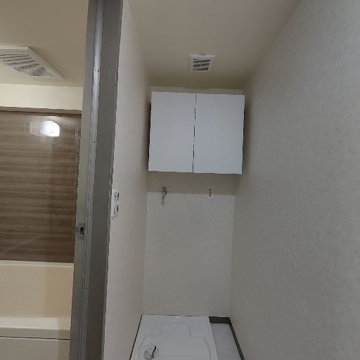 • 洗濯機上部の吊戸棚で追加収納が見込める(確度90%):洗濯機置き場の上に収納棚が設置されており、洗剤やタオル類の保管に使える可能性が高い。