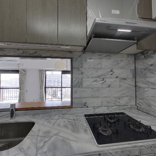 • キッチンからリビングの様子を見渡せる(確度93%):コンロ・シンク前の開口部越しにバルコニー側の掃き出し窓やリビング空間が見えており、対面に近い開放感のあるキッチン配置と判断できる。