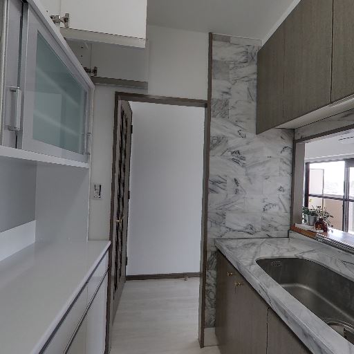 • 収納量は比較的しっかりありそう(確度89%):吊戸棚、シンク下・コンロ下収納に加え、別面に可動棚付きの収納やカップボードが見えるため、キッチン用品や食器を整理しやすい構成と考えられる。