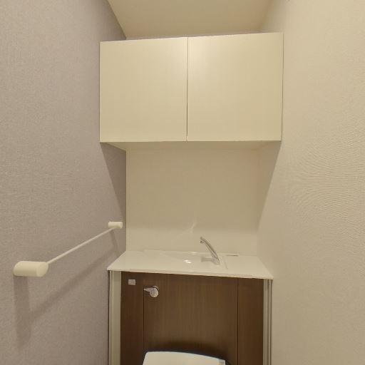 トイレ内に独立した手洗い器がある(確度95%):便器とは別に小型の手洗いカウンターと収納が設けられており、来客時や使用後の手洗いがしやすい構成に見える。