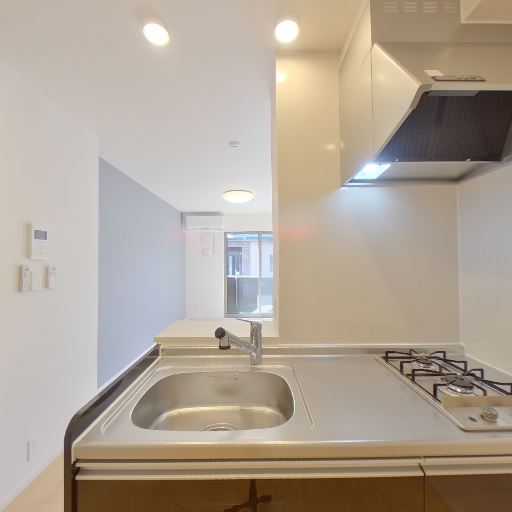 キッチン設備が比較的新しく整っている(確度92%):システムキッチンにシンク、2口ガスコンロ、レンジフード、吊戸棚が確認でき、全体的に清潔感もある。