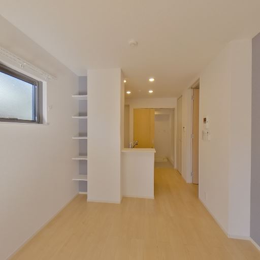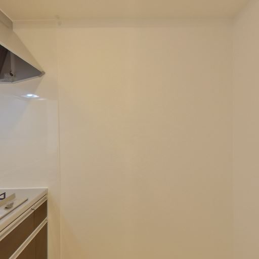 キッチン背面の壁は活用余地があるが単調(確度72%):キッチンの反対側に大きな壁面があり、家具配置やラック設置には使えそうだが、現状ではやや閉塞感の出やすい面でもある。