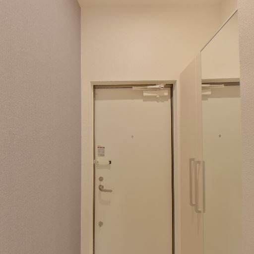 玄関まわりに収納がある(確度89%):玄関扉の横に縦長の収納扉と取っ手が見え、下足入れや玄関収納が備わっている可能性が高い。