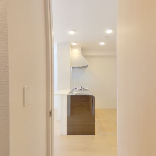 キッチンが玄関から近い動線(確度81%):廊下の先にキッチンが見えており、玄関から居住スペースへスムーズにアクセスできる間取りと推測される。