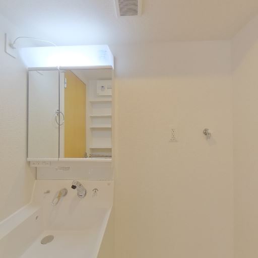 独立洗面台があり使い勝手がよい(確度94%):三面鏡付きの独立洗面台が設置されており、身支度や収納の面で利便性が高い。
