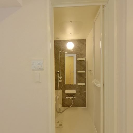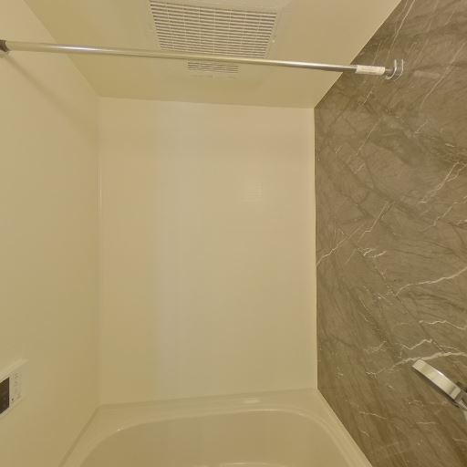 浴室乾燥・換気に期待できる設備(確度85%):天井に換気口があり、浴室内にも物干しバーが設置されているため、浴室乾燥や室内干しを想定した設備構成と考えられる。