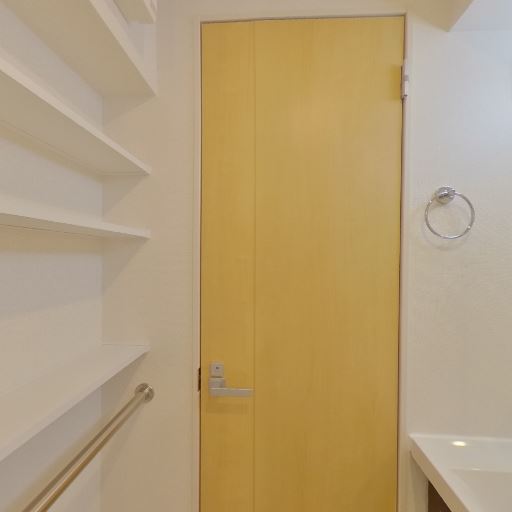 洗面所まわりの収納が充実している(確度90%):壁面に可動棚とタオルバーがあり、洗面まわりの小物やタオル、洗剤類を整理しやすい構成に見える。