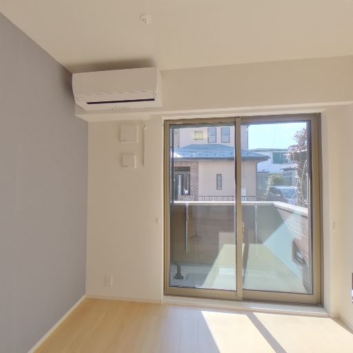 エアコン設置済み(確度97%):窓上部付近に壁掛けエアコンが確認でき、入居後すぐに空調を使える状態に見える。