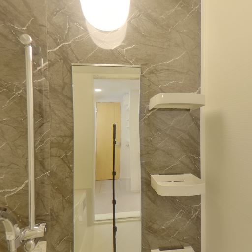 アクセントパネルで見た目が良い(確度92%):浴室の一面に石目調のアクセントパネルが使われており、標準的な白一色よりもデザイン性が感じられる。