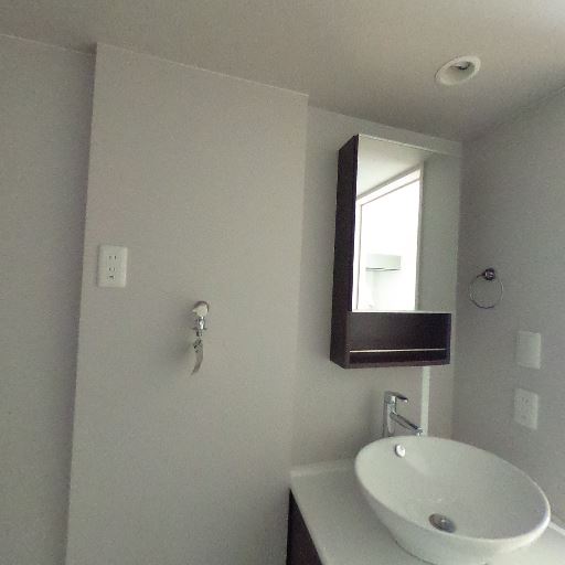 洗面台と鏡収納付きの独立洗面所(確度86%):ボウル型の洗面台とミラーキャビネットがあり、手洗いや身支度がしやすい。