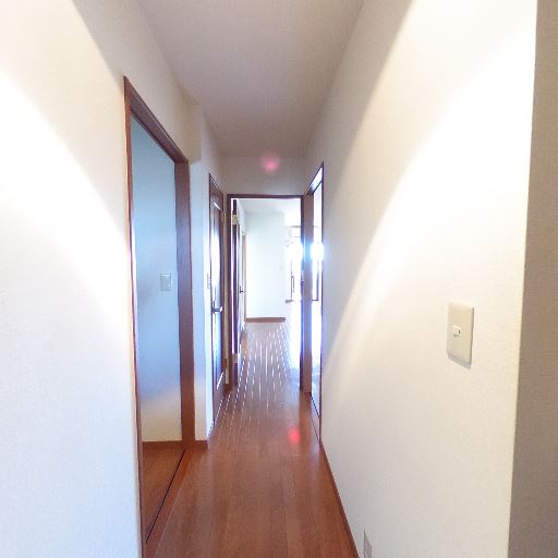 • 明るい廊下と奥行き(確度72%):玄関から続く廊下が一直線で奥に採光があり、明るさが入っている。