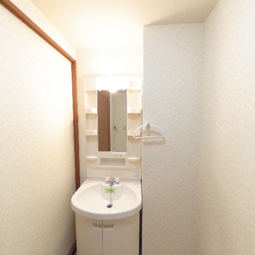 • 収納・タオル掛けの備え付け(確度80%):洗面台周りの小棚と、壁にタオルリングが見える。