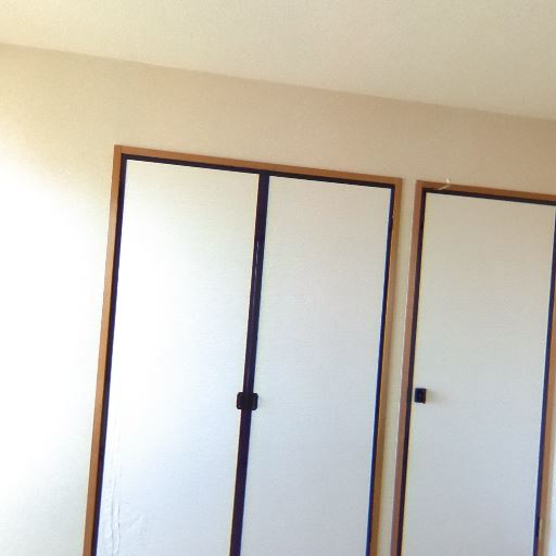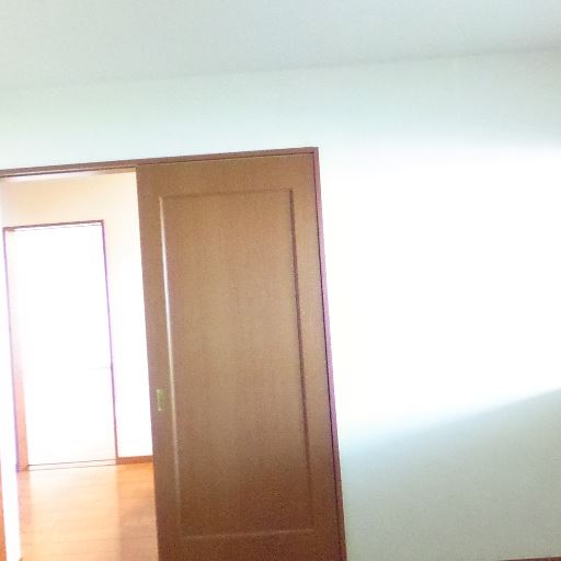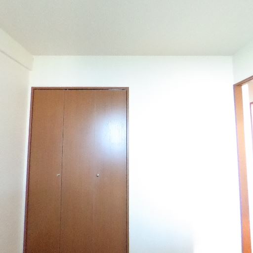 • 収納あり(クローゼット)(確度83%):木目の観音開きのクローゼット扉が確認できる。部屋内に収納スペースが確保されている。
