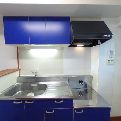 • キッチンの設備が充実(確度86%):シンクが広く、ステンレス天板の作業スペースと2口コンロ、レンジフードが確認できる。上部・下部に収納も多い。