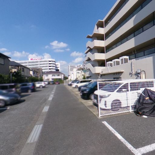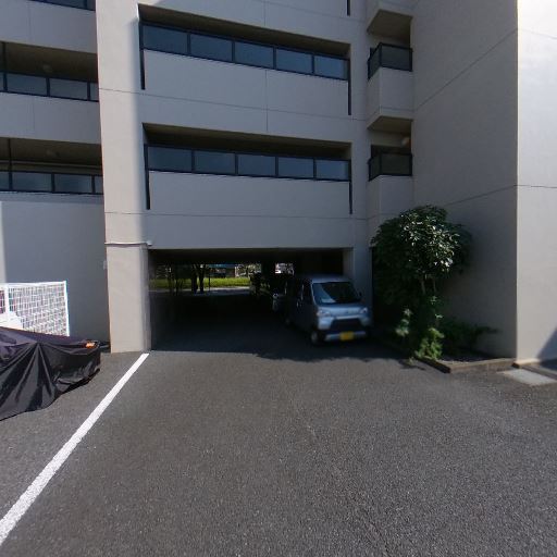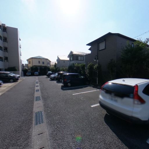 • 屋外駐車場に面した立地(確度90%):周囲はアスファルト敷きの駐車場で、複数台分の区画と車両が確認できる。低層住宅と中規模集合住宅が混在するエリアに面している。