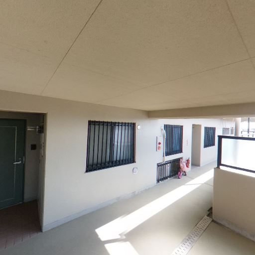 • 共用廊下タイプの外部共用部(確度90%):屋外に面した共用廊下で、各戸の玄関扉が並ぶ配置に見える。手すりや腰壁があり、風や日光が入る半屋外空間。