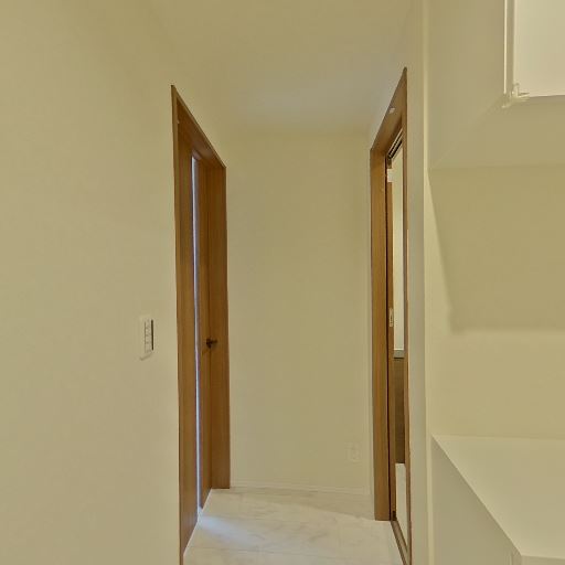 動線とドア配置(確度69%):玄関から廊下に続き、右手に室内ドアが並ぶ。出入りの際にぶつかりにくい余裕がある。