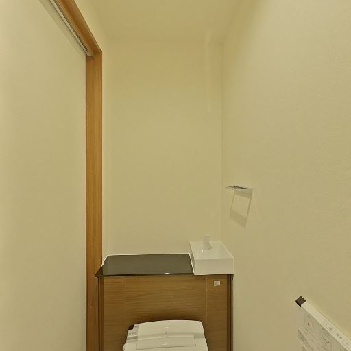 トイレ一体型の手洗いカウンター(確度86%):便器背面に収納付きのカウンターと独立手洗いボウルがあり、空間を有効活用している。