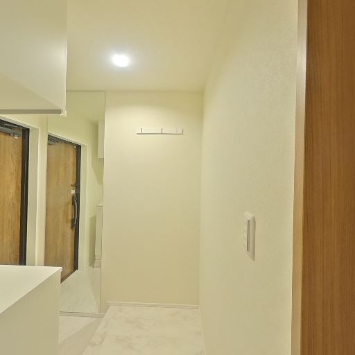 玄関・土間の清潔感(確度76%):白系の床材と壁で明るく、シューズボックスや手すりが見える。新しめで汚れは目立たない。