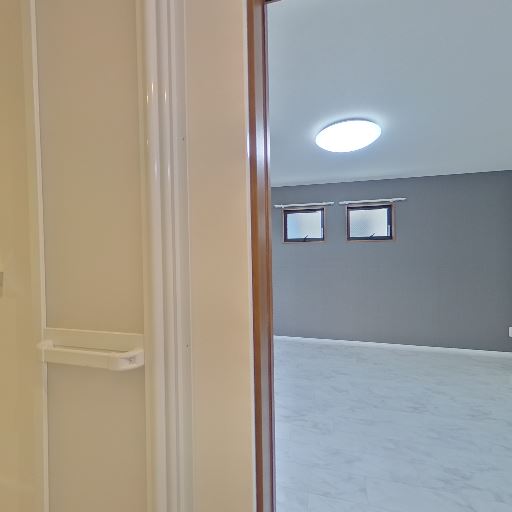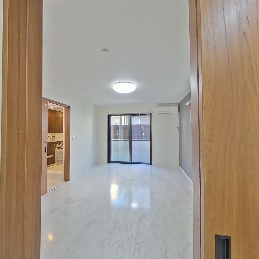 室内からの見通し(確度73%):掃き出し窓の先にLDKが続き、室内は白基調で照明が明るい。