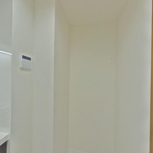 洗濯機置き場の位置(確度86%):洗面室内に洗濯機パンが設置されている。