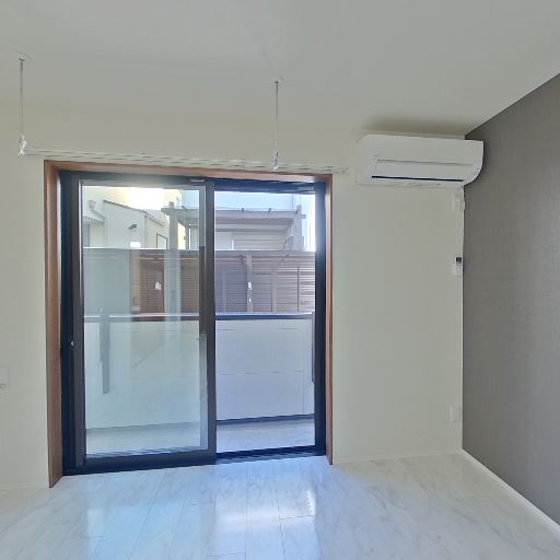 採光と通風(確度86%):掃き出し窓と2つの小窓があり、日中の明るさと風通しが期待できる。バルコニー側は半透明パネルで視線もある程度遮られる。
