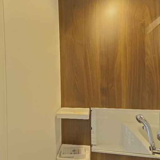 追い焚き・浴室リモコンの存在(確度78%):木目パネル側に操作パネルが2基見える。給湯や追い焚き等の操作ができるタイプと推測。