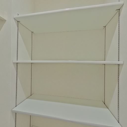 可動棚の収納(確度83%):壁面に3段の可動棚があり、小物やリネンの整理に使えそう。耐荷重レール式で位置調整が可能に見える。