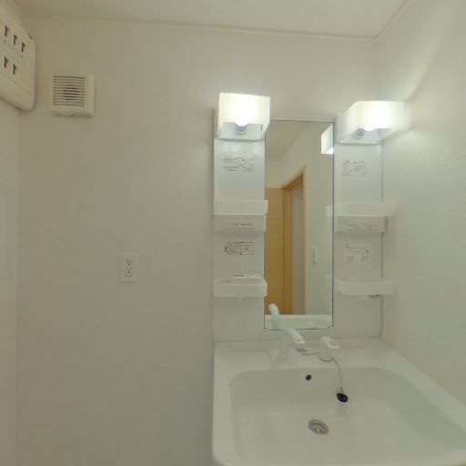 • 独立洗面台(照明・収納付き)(確度86%):鏡の両側に照明と小物棚があり、洗面ボウルも広めに見える。