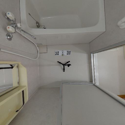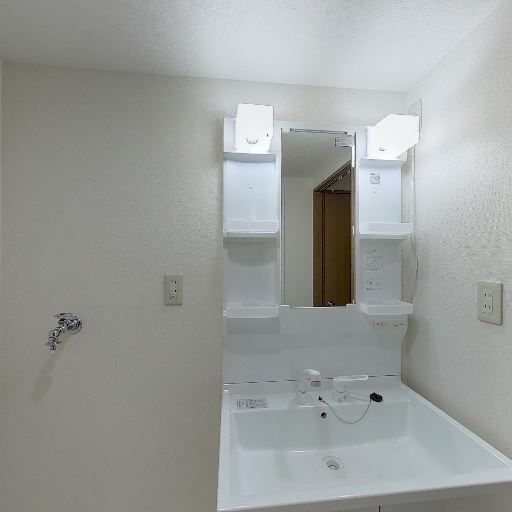• 脱衣所に洗濯機置き場あり(確度95%):床のパンと給水・排水口、コンセントが壁に設置されている。