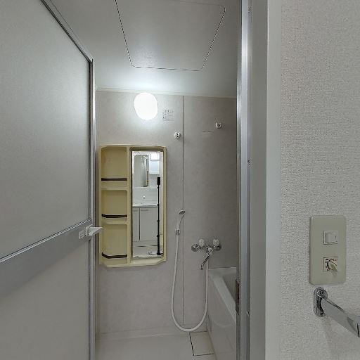 • 浴室が近接し利便性良好(確度86%):引き戸の先に浴室。シャワー・浴槽・鏡・棚が確認できる。