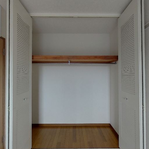 • クローゼットの収納力(確度86%):左右に観音開きの扉があり、奥行きのあるスペースと上部棚・ハンガーパイプが備わっている。衣類の吊り下げと小物置きが可能。