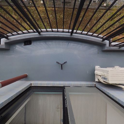 • バルコニーの防水・排水状況(確度70%):天井にはドレンらしき排水口、床面には勾配と排水口が確認できる。劣化やひび割れは見当たらない。