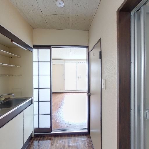 居室への引き戸で省スペース(確度80%):キッチンから奥の居室へは格子入りの引き戸で仕切られている。
