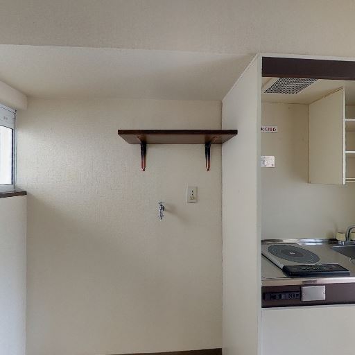 洗濯機置場らしき給水栓と棚(確度78%):壁面に給水栓とコンセント、上部に小棚が設置されている。