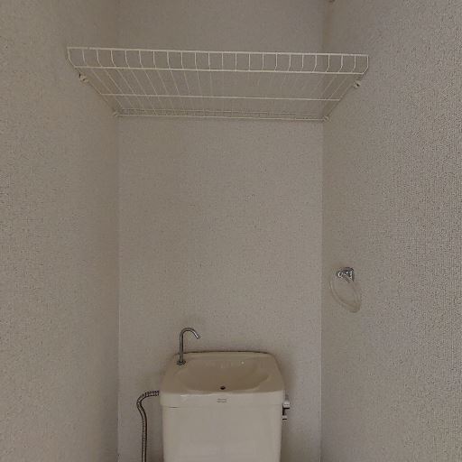 上部収納ラックあり(確度90%):手洗い器の上にワイヤーシェルフが設置されており、トイレットペーパー等の収納に使える。
